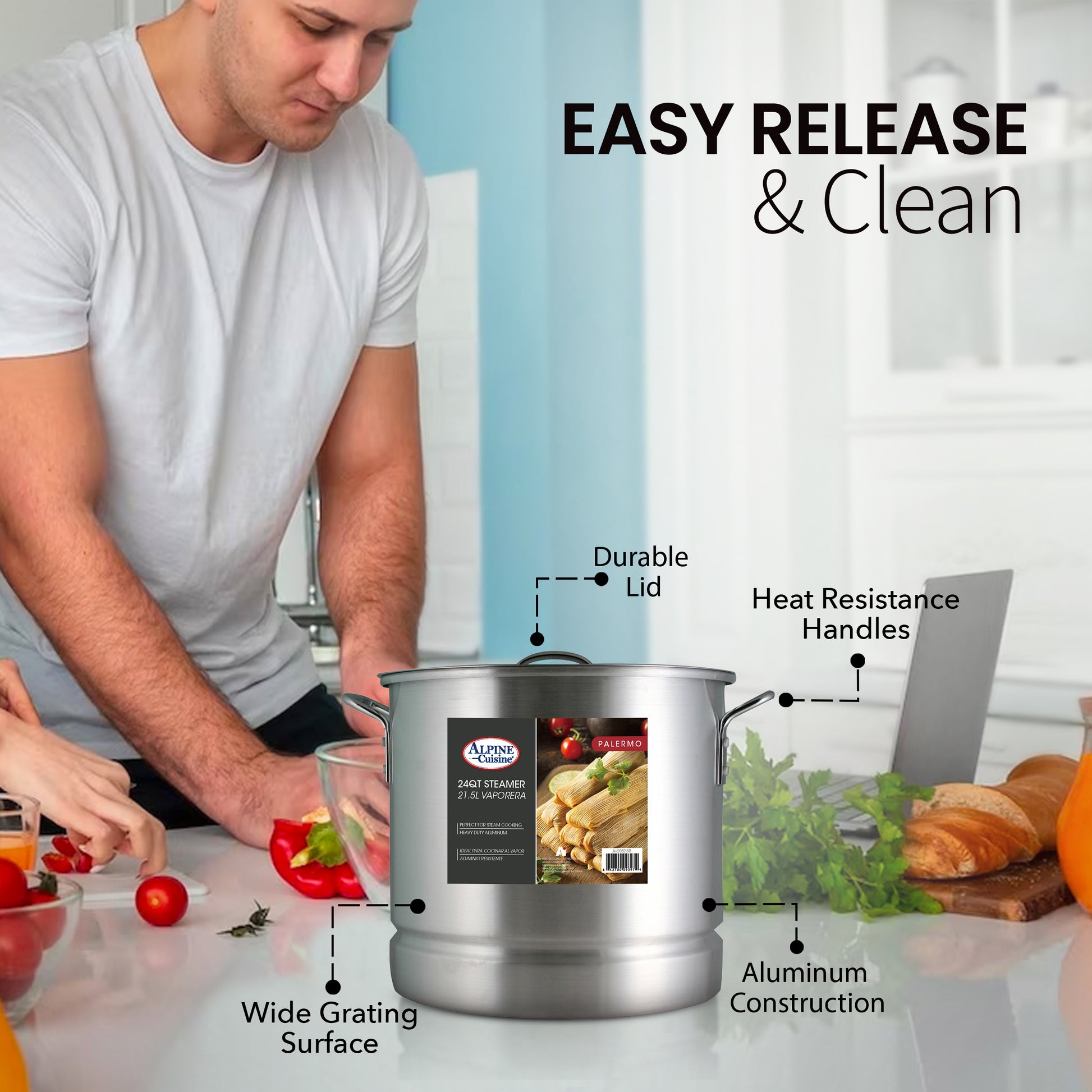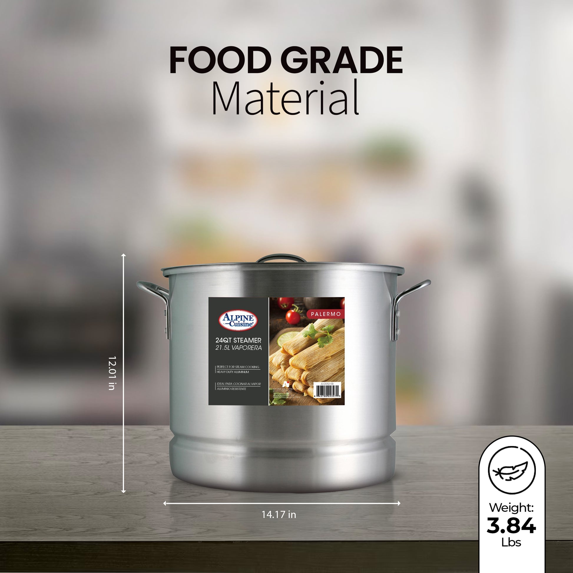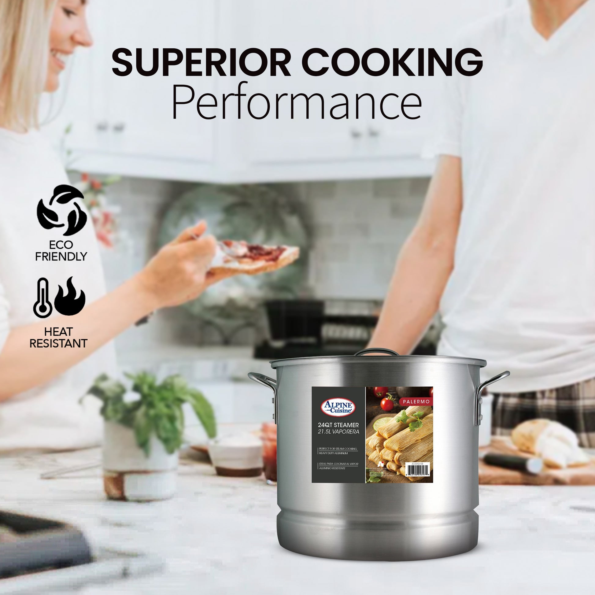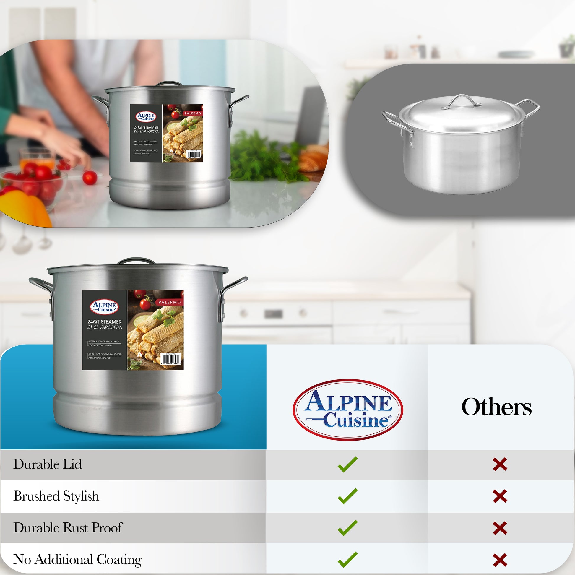 Alpine Cuisine Aluminum Steamer Stock Pot with Cooking Pot Lids 24 Quart | Durable Multi-Tier Steaming Large Capability | Ergonomically Designed Handles for Safety | Easy to Use & Effortless Clean