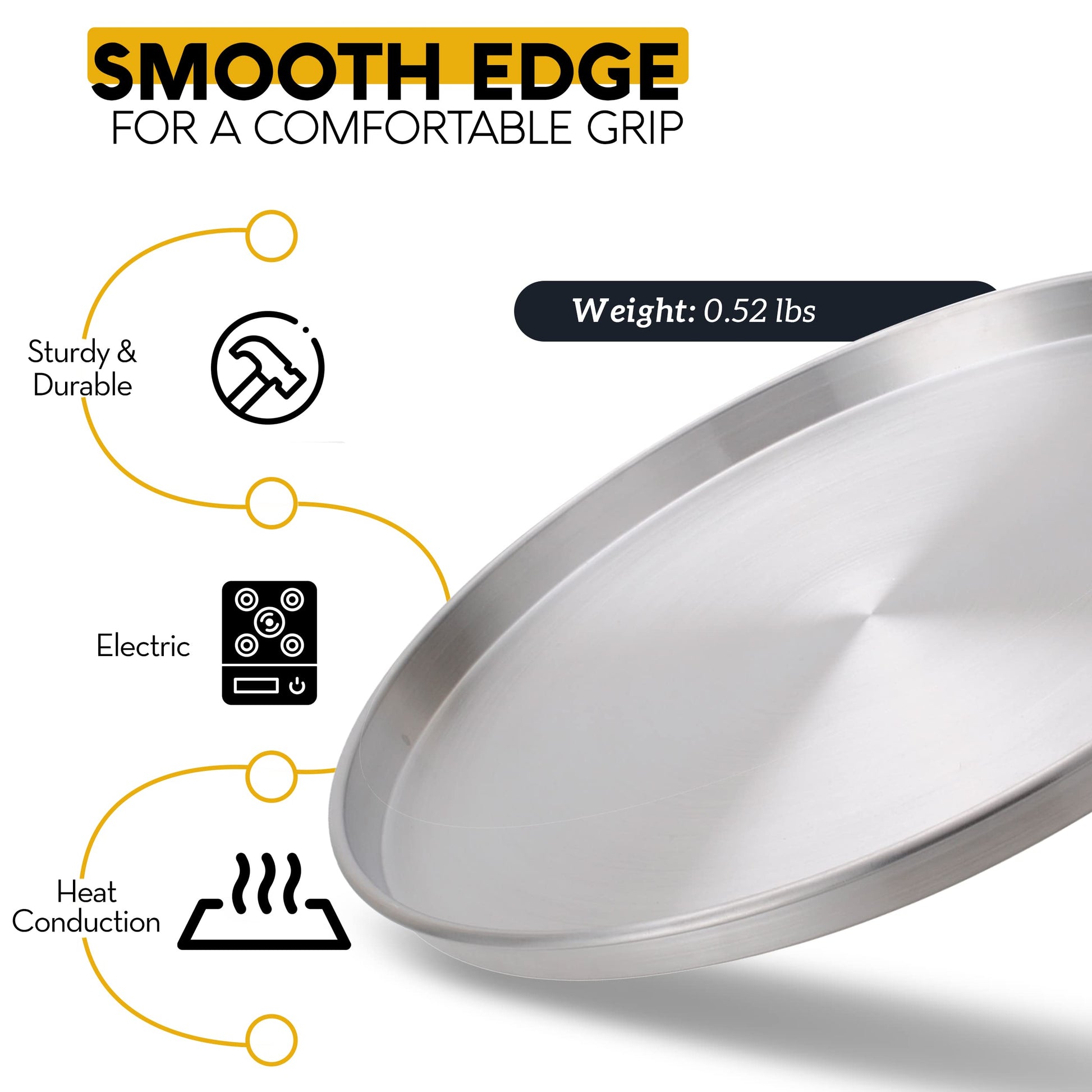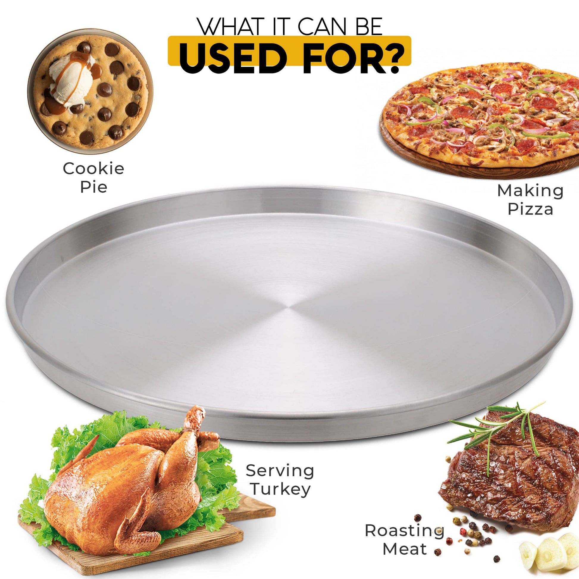 HEAVY DUTY: The pizza tray for oven is constructed with heavy-gauge aluminum that resists warping and will never rust for a lifetime of durability. Heat is evenly distributed to bake delicious pizza with perfect results every time. The mirror-finished surface of the oven baking pan ensures less sticking and easy-to-release food. Disperse heat evenly so your pizza cooks to perfection without a hot spot.