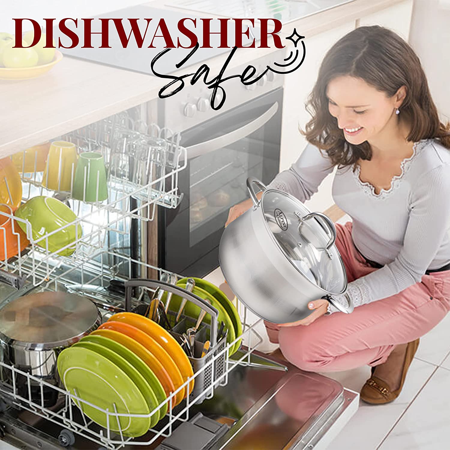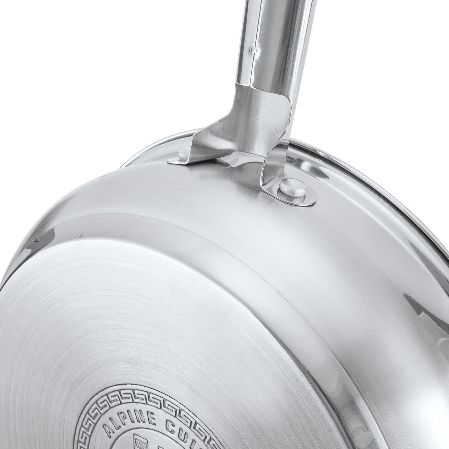 DISHWASHER SAFE AND EASY TO CLEAN: The Alpine cuisine Tri-Ply Stainless Steel Covered Cookware Set is dishwasher safe for quick and easy cleaning. You won't need to worry about laborious scrubbing and hand washing because our nonstick cookware sets are made entirely of stainless steel and are dishwasher safe. The non stick cookware is durable and heats up quickly and evenly.