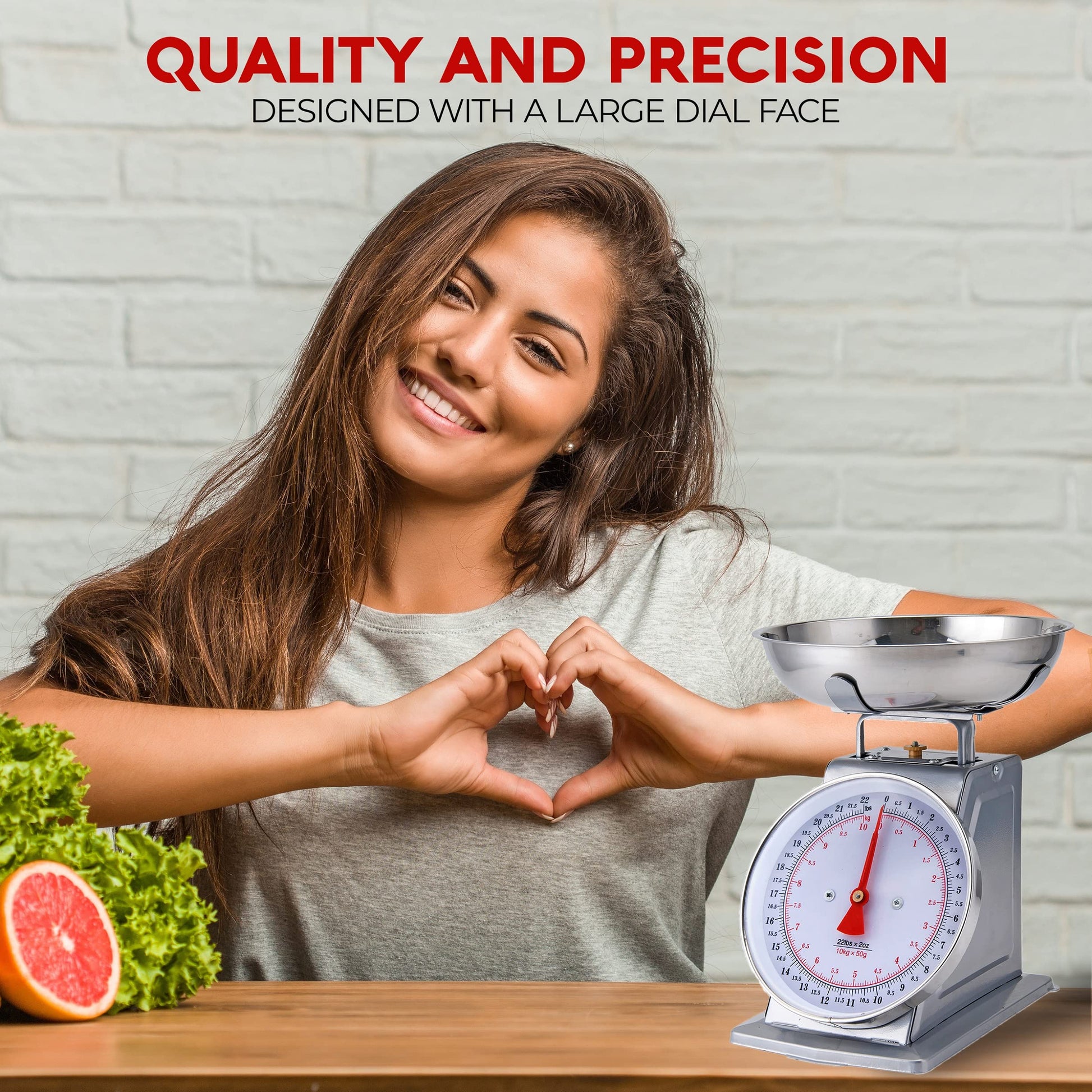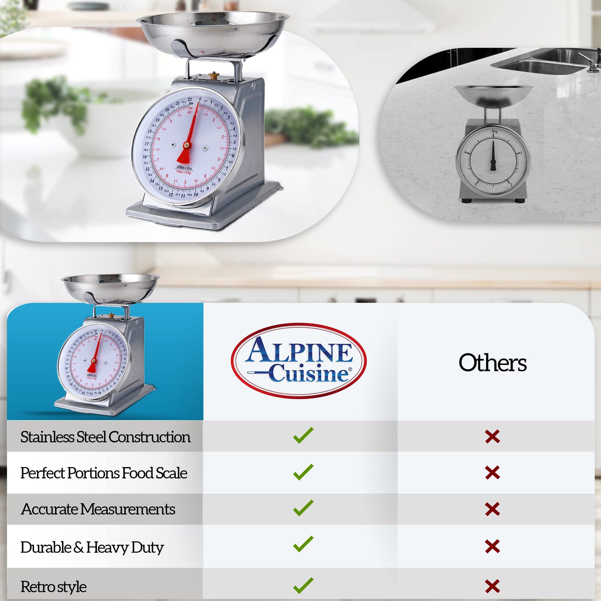 QUALITY AND PRECISION: Alpine Cuisine has made precision food scales for kitchen measurement, using the highest quality components for accurate weights. You can measure food with an analog scale in pounds, ounces, kilograms, or grams up to 22 lbs. (10 kilograms). We create kitchen gadgets to cut out the guesswork of cooking, leaving you with quality and precision.